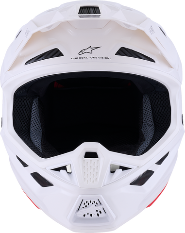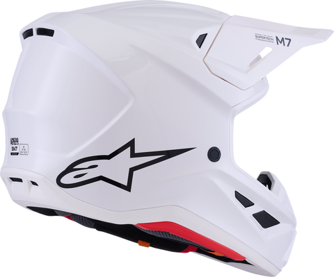 The Alpinestars SM7 helmet is engineered specifically for off-road racing, offering a perfect balance of ventilation, comfort, and impact protection. Its lightweight composite shell features an aerodynamic profile designed to minimize drag and withstand high-impact forces, making it ideal for demanding off-road environments. The shell's curved design promotes energy deflection and reduces friction during impacts, providing enhanced safety for riders. Integrated PLASMA technology at the lower shell edge enhances energy dissipation in collision areas near the collarbone, further reducing injury risk. The helmet's streamlined construction features a smooth surface free of external channels that could compromise structural integrity, ensuring maximum durability and safety during aggressive riding conditions.