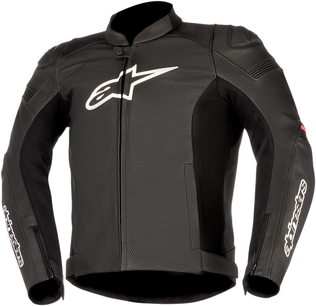 Durable 1.3 mm premium leather construction with flexible leather accordion stretch panels on the elbows and upper arms for contoured fit and comfort., Extensive high-density perforation panels on front and rear for excellent levels of interior cooling and comfort., Chest pad and back compartments with advanced poly-foam padding (Alpinestars Nucleon chest and back protection available as accessory upgrade, sold separately)., Strategically placed stretch poly-textile panels on underarms, torso and rear shoulder helps movement and comfort on the bike., Snap button system to integrate the Alpinestars Nucleon Back protector., Removable CE-certified, race-developed internal protectors offer lightweight performance and superior impact protection to shoulders and elbows., Shoulder protection features over-molded advanced Thermoplastic Polyurethane (TPU) guard layered under the outer fabric for optimized levels of protection and comfort., Large accordion leather stretch inserts on elbows and upper arms for movement on the bike and which help reduce rider arm fatigue., D-ring waist adjustment helps keep jacket firmly in place and ensures precision fit., Internal mesh inserts on collar and cuffs for improved comfort and airflow., Inner waterproof pocket plus internal compartments for safe and convenient storage., Cuff adjustment includes snaps and semi-auto locking zips for range of fit and improved comfort, plus snap button fixtures on collar and waist., Waist connection zipper allows attachment to Alpinestars riding pants., Fixed mesh lining to improve comfort and ventilation with multiple compartment pockets., External zippered plus inner waterproof compartment for safe peace-of-mind storage.