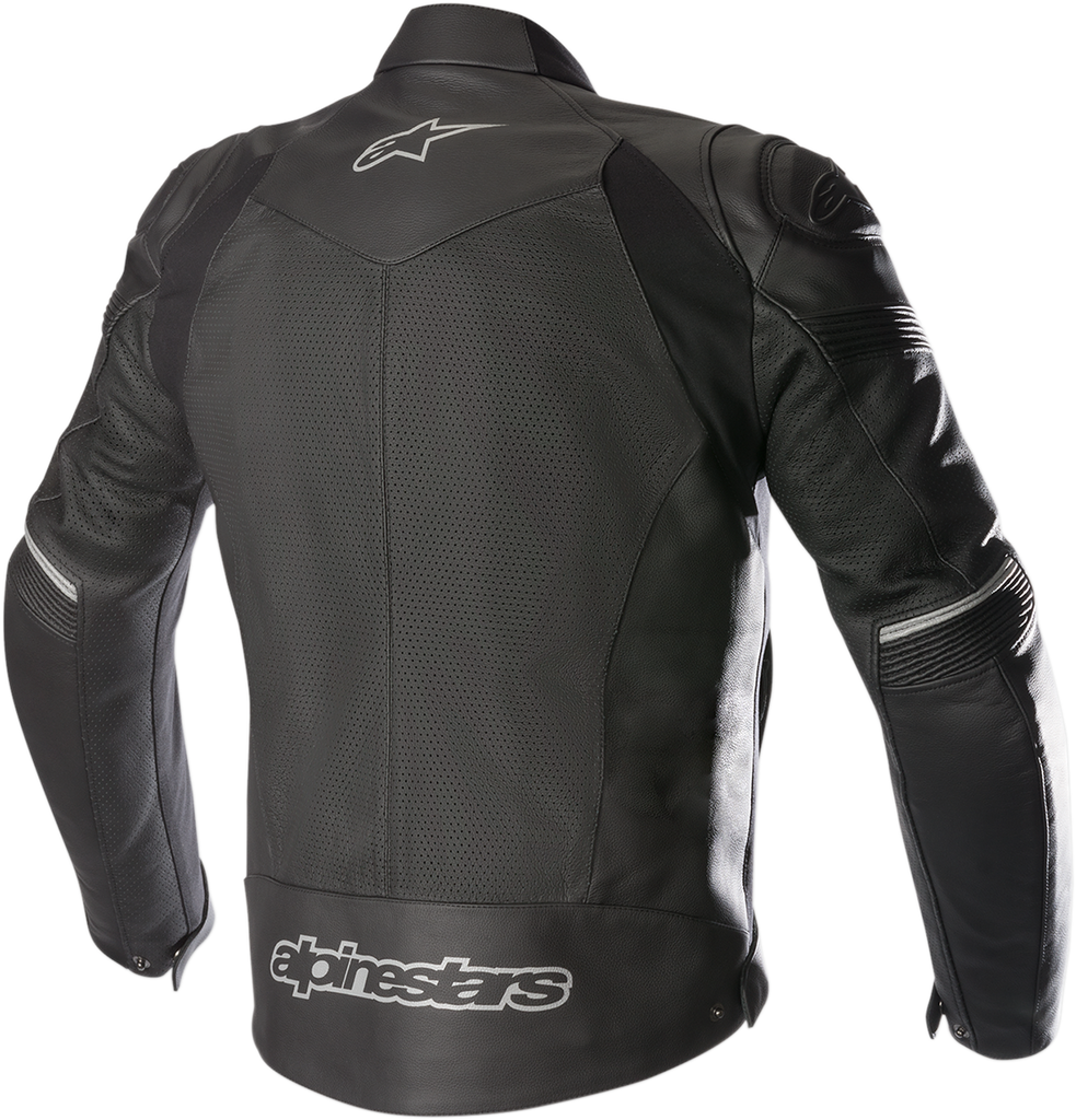 Durable 1.3 mm premium leather construction with flexible leather accordion stretch panels on the elbows and upper arms for contoured fit and comfort., Extensive high-density perforation panels on front and rear for excellent levels of interior cooling and comfort., Chest pad and back compartments with advanced poly-foam padding (Alpinestars Nucleon chest and back protection available as accessory upgrade, sold separately)., Strategically placed stretch poly-textile panels on underarms, torso and rear shoulder helps movement and comfort on the bike., Snap button system to integrate the Alpinestars Nucleon Back protector., Removable CE-certified, race-developed internal protectors offer lightweight performance and superior impact protection to shoulders and elbows., Shoulder protection features over-molded advanced Thermoplastic Polyurethane (TPU) guard layered under the outer fabric for optimized levels of protection and comfort., Large accordion leather stretch inserts on elbows and upper arms for movement on the bike and which help reduce rider arm fatigue., D-ring waist adjustment helps keep jacket firmly in place and ensures precision fit., Internal mesh inserts on collar and cuffs for improved comfort and airflow., Inner waterproof pocket plus internal compartments for safe and convenient storage., Cuff adjustment includes snaps and semi-auto locking zips for range of fit and improved comfort, plus snap button fixtures on collar and waist., Waist connection zipper allows attachment to Alpinestars riding pants., Fixed mesh lining to improve comfort and ventilation with multiple compartment pockets., External zippered plus inner waterproof compartment for safe peace-of-mind storage.