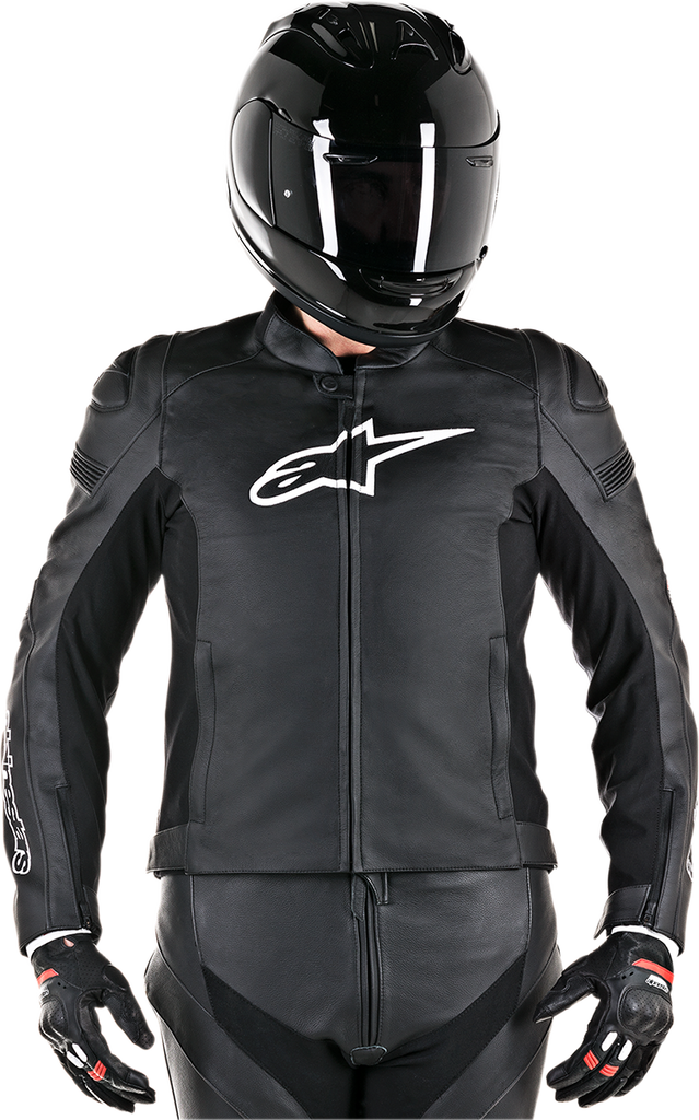 Durable 1.3 mm premium leather construction with flexible leather accordion stretch panels on the elbows and upper arms for contoured fit and comfort, Chest pad and back compartments with advanced poly-foam padding (Alpinestars Nucleon chest and back protection available as accessory upgrade, sold separately)., Strategically placed stretch poly-textile panels on underarms, torso and rear shoulder helps movement and comfort on the bike., Shoulder protection features over-molded advanced Thermoplastic Polyurethane (TPU) guard layered under the outer fabric for optimized levels of protection and comfort., Removable, race-developed internal protectors offer lightweight performance and superior impact protection to shoulders and elbows., Large accordion leather stretch inserts on elbows and upper arms for movement on the bike and which help reduce rider arm fatigue., D-ring waist adjustment helps keep jacket firmly in place and ensures precision fit., Internal mesh inserts on collar and cuffs for improved comfort and airflow., Inner waterproof pocket plus internal compartments for safe and convenient storage., Cuff adjustment includes snaps and semi-auto locking zips for range of fit and improved comfort, plus snap button fixtures on collar and waist., Waist connection zipper allows attachment to Alpinestars riding pants., Fixed mesh lining to improve comfort and ventilation with multiple compartment pockets., External zippered plus inner waterproof compartment for safe peace-of-mind storage., Snap button system to integrate the Alpinestars Nucleon Back protector.