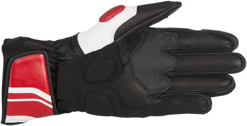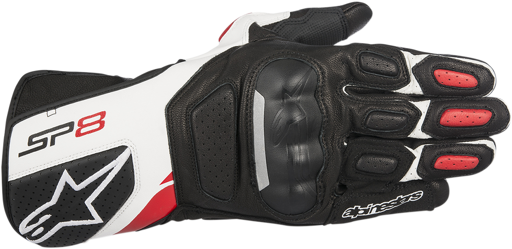 Premium, full-grain leather construction is durable and offers excellent abrasion resistance, An innovative microfiber and Polyurethane (PU) grip insert strategically position on palm and thumb, Alpinestars’ exclusive ergonomic stretch insert between palm and thumb, Premium quality suede palm and landing reinforcement., Alpinestars’ patented third and fourth finger bridge, Advanced over-molded polymer knuckle protector, Ethylene-Vinyl Acetate (EVA) foam padding reinforcements on thumb, wrist, back of hand, finger and palm, Perforated leather cuff, plus perforated finger sidewalls for superb breathability, Velcro cuff closure, plus elasticized wrist design for secure, personalized fit, Touchscreen compatible fingertip on index finger, Pre-shaped, anatomical finger design and external seams