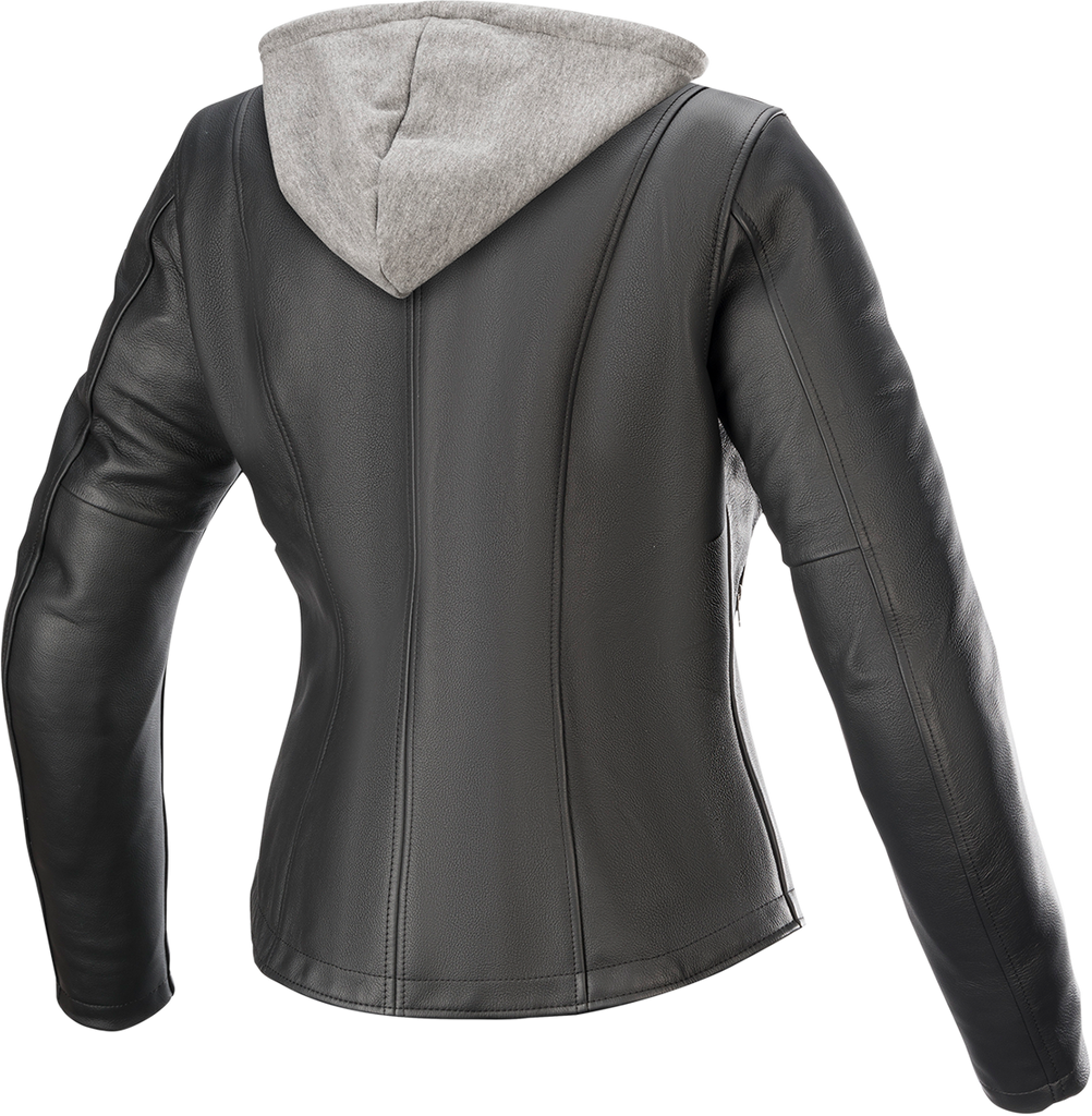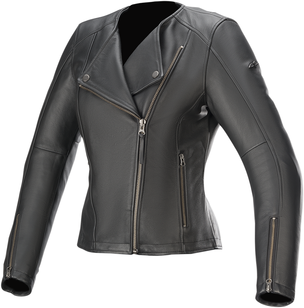Anatomically profiled for a fully optimized female fit., Premium leather main chassis constructed from 1.3mm genuine bovine leather., Alpinestars Nucleon Flex Plus armor on shoulder and elbow (Alpinestars Nucleon back protector available as an accessory upgrade, sold separately)., Double breasted front closure with YKK metal zipper ensures a secure closure., YKK metal zipper on cuff with leather gusset for enhanced rider comfort., Two zippered hand pockets, inner waterproof document pocket and two inner liner pockets for safe and secure storage., Removable thermal hooded vest allows riders to adjust the jacket to suit the weather conditions