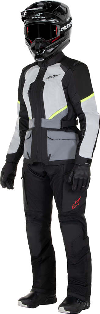 Anatomically optimized for a women*s specific fit, the Stella Andes Air Drystar? Jacket has been engineered to deliver optimal protection, comfort, ventilation and airflow in warm riding conditions, while still having the capability to be quickly and easily adapted to tackle cooler temperatures and wet weather, allowing it to be the ideal dual season touring jacket, Road-orientated fit, with reduced length, a contoured bottom edge and pre-shaped arms for superior rider comfort and reduced fatigue, 2D mesh on the chest, inner arms and back for optimized airflow and ventilation in warm riding conditions, 100% waterproof and breathable, detachable Drystar? membrane can be worn over or under the jacket, allowing it to be easily and quickly adapted to best match the weather conditions, Tech-Air? 5 and Tech-Air? 3 ready, Ripstop reinforcements on shoulders, elbows and forearms for abrasion resistance, Poly-fabric chassis for high levels of durability, Storm collar for the prevention of water ingress, Long mesh panels on the chest for enhanced airflow, Volume adjuster on the biceps, with hook and loop volume adjusters on the forearms, hook and loop cuffs, and a hook and loop waist adjuster for an optimized fit, Storage pouch on the lower back of jacket, Fixed mesh liner with 3/4 zippered waist connector for quick and easy connection to Alpinestars pants, Divided chest protector pocket and back protector pocket ready to accept chest and back armor, available as an optional accessory upgrade, Waterproof compartment and internal pocket for safe and secure storage of valuables