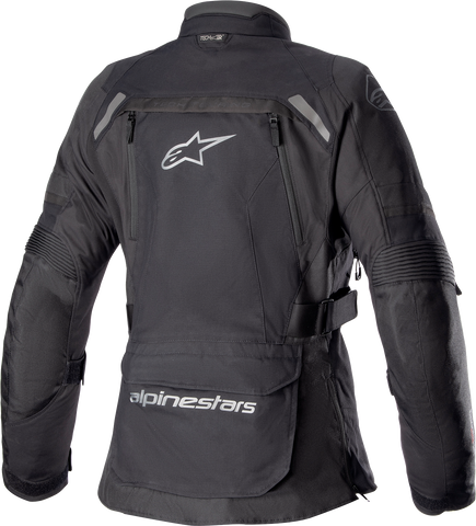 Multi-material construction with a highly abrasion and tear resistant poly-fabric main shell and multi-panel mesh lining for comfort and durability, Anatomically shaped for female-specific fit, Removable and interchangeable waterproof and breathable DRYSTAR® full liner with taped seams to ensure long term water-repelling performance, Removable shoulder and elbow protection for superb impact protection, Long sleeve thermal liner (100g on body, 80g on sleeves) ensures jacket versatility and comfort in cold and hot conditions and can be fully removed with easy identification red zippers and integrated stretch comfort edge, Chest and back pad compartments with PE padding (Alpinestars Nucleon chest and back inserts available as accessory upgrade), Anatomical, pre-curved sleeve design incorporates dual hook and loop gripclosure and snap button volume control adjustment straps for improved comfort, precision adjustment of garment and to help keep elbow protections in place, Jet Ventilation System (JVS): strategically positioned zippered air intakes on torso with rear air exhaust vent on upper back for cooling performance on long rides, Four external front pockets for convenient storage, including two waterproof pockets and two large cargo pockets, plus external large rear utility pocket, Air vents on sleeves incorporates mesh gussets and zipper closures for improved levels of ventilation control, Accordion textile flex inserts on elbows for arm flexibility, Collar construction incorporates comfort lining and features Hook and loop grip closure and strap hook to allow collar to be securely kept in place while open, Fine-tuned fit afforded by D-ring and buckle waist adjustment for a secure, personalized fit while riding, Internal pockets are waterproof and zippered for peace-of-mind closure, Extended profile lower back for riding comfort for extra protection in the lumbar region, Two internal waist connection zippers (on main shell and on DRYSTAR® membrane) for attachment to Alpinestars riding pants, Reflective detailing on front and back improves rider visibility, Premium YKK® zips used throughout