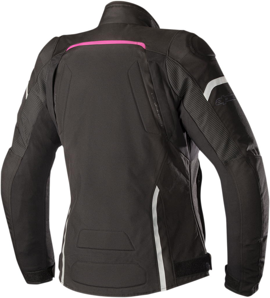 Specifically designed and constructed for an optimized female fit, Clean-style sport jacket, Alpinestars Bio Armor protectors at the shoulders and elbows, New GP Lite shoulder protectors feature over-molded advanced Thermoplastic Polyurethane (TPU) guards layered under the outer fabric, Chest and sleeve fit adjusters, volume adjusters on sleeves, Removable long-sleeve thermal liner, Waterproof, breathable Drystar™ membrane full liner with taped seams, Wrist hook-and-loop closure and adjustment, Multiple ventilation zippers, Large stretch panel on top back, sides and arms, Two zippered side pockets, Chest and back padding compartments with Polyethylene (PE) padding (Alpinestars Nucleon chest and back pads available separately), Internal waist connection zipper for attachment to Alpinestars riding pants, Premium YKK front zipper closure, Integrated soft-edge collar construction, Hook-and-loop collar adjustment and closure, Pre-curved sleeves for increased comfort in the riding position
