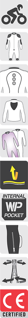 Anatomically profiled and body engineered for a fully optimized female fit, Durable premium leather main chassis constructed from 1.3 mm high grade leather, Extensive accordion stretch panels offer improved movement and comfort on the bike, Stretch fabric comfort panels on sleeves, crotch and chest areas further improve performance fit and feel, Ergonomic back hump is profiled for a woman rider’s anatomy and is developed for airflow and performance at speed, Pre-curved arm and leg construction to reduce fatigue and improve comfort, Zippered ventilations of the chest for cooling airflow and ventilation, Localized perforations are strategically positioned for improved ventilation, Stitched leather graphic detailing and printed logos for unique styling, Calf expansion gusset caters to a wide range of lower legs sizes for fit and comfort, Integrated padding for increased comfort and protection, Multi-layer, reinforced knee construction complete with grippy texture on the inside allows the rider to better hug the bike’s contact area, thus reducing fatigue and improving control, Removable mesh full inner liner for convenience and breathability, Inner waterproof wallet / document pocket for convenient storage of small items, 3D textured fabric comfort collar construction, Stretch textile cuff and calf adjustment system for close and secure fit