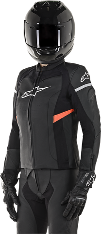 Optimized for a women's performance fit, Main chassis constructed from 1.3 mm premium bovine leather, Large accordion stretch panels help movement and comfort on the bike, Stretch panels on sleeves and chest further improve fit and feel, Waist adjustment for an improved riding fit, Two zippered hand pockets for real-world practicality, Waist connection zipper allows quick and easy attachment to Alpinestars riding pants, Print logos and direct print graphic details, Zippered air intake vents are strategically positioned for optimized airflow, Localized perforations for excellent ventilation and internal airflow, Low profile collar construction with microfiber comfort edging plus 3D textured fabric comfort inner collar lining for high levels of rider comfort, Pre-curved sleeve construction reduces fatigue, Reflective details to make the rider more visible to other road users, Chest and back compartments are designed to accommodate the Alpinestars Stella Nucleon chest and back inserts, available separately, Multiple snap button system to integrate the Level 2 Alpinestars Nucleon Back protector, Waterproof inner wallet pocket for peace-of-mind storage, Inner removable thermal liner for versatility, Bio Armor shoulder and elbow protectors
