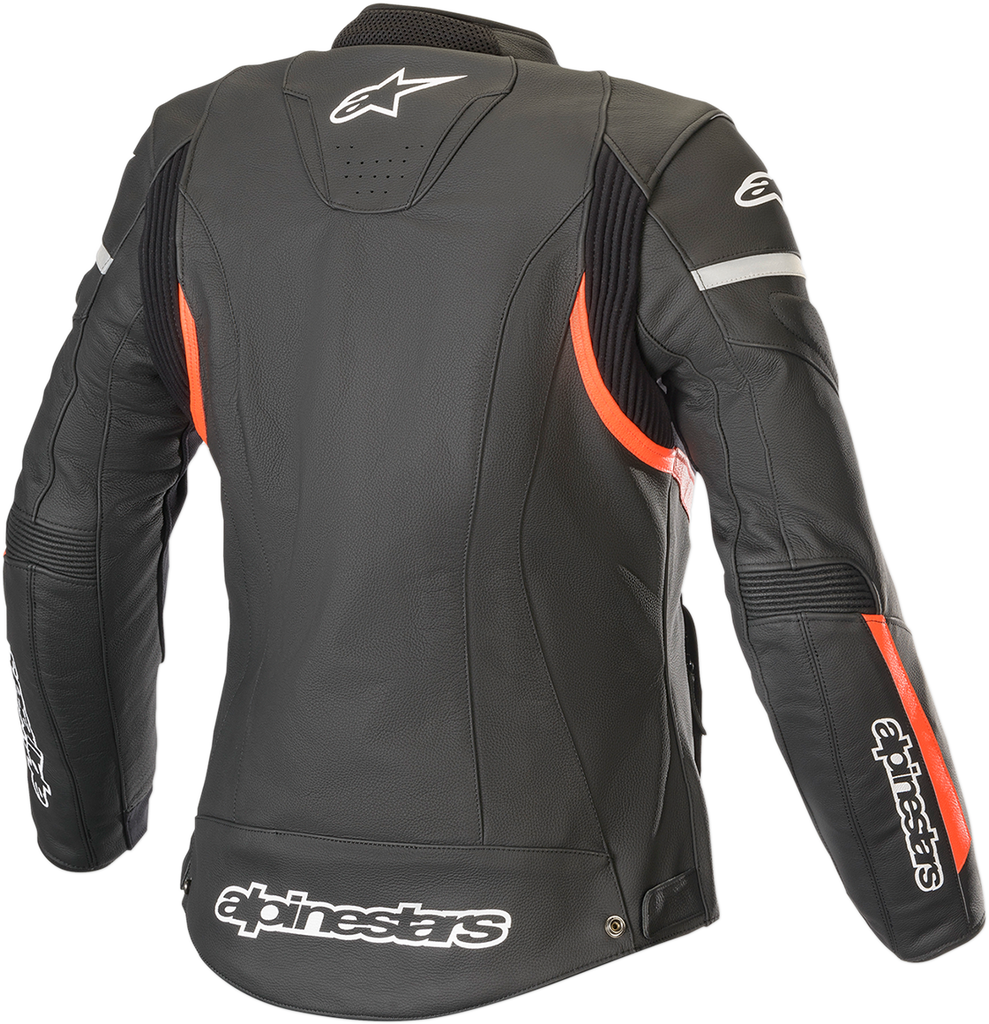 Optimized for a women's performance fit, Main chassis constructed from 1.3 mm premium bovine leather, Large accordion stretch panels help movement and comfort on the bike, Stretch panels on sleeves and chest further improve fit and feel, Waist adjustment for an improved riding fit, Two zippered hand pockets for real-world practicality, Waist connection zipper allows quick and easy attachment to Alpinestars riding pants, Print logos and direct print graphic details, Zippered air intake vents are strategically positioned for optimized airflow, Localized perforations for excellent ventilation and internal airflow, Low profile collar construction with microfiber comfort edging plus 3D textured fabric comfort inner collar lining for high levels of rider comfort, Pre-curved sleeve construction reduces fatigue, Reflective details to make the rider more visible to other road users, Chest and back compartments are designed to accommodate the Alpinestars Stella Nucleon chest and back inserts, available separately, Multiple snap button system to integrate the Level 2 Alpinestars Nucleon Back protector, Waterproof inner wallet pocket for peace-of-mind storage, Inner removable thermal liner for versatility, Bio Armor shoulder and elbow protectors