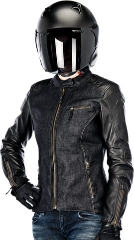 Created to ensure optimized female fit, Light, removable, performance elbow and shoulder protectors are reduced in thickness to improve styling, Supple and durable full-grain leather on sleeves and shoulders, Main outer shell constructed from indigo denim, Leather accordion inserts strategically positioned on elbows, Contemporary styled, low-profile collar, Snap closures on collar and cuffs for easy, secure fastening, Leather detailing around pocket openings, plus auto-locking zips with leather pull-tabs, External zippered pocket, plus internal waterproof pocket, Embossed logos on shoulders, Reflective piping to the front and rear improves rider visibility