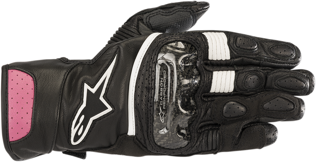 Developed specifically for an optimized woman's fit, Full premium leather main construction, with leather palm for comfort and control and perforated leather on top of hand and wrist for breathability, Ergonomically shaped Alpinestars' carbon knuckle guard is reinforced on the interior side with thick EVA foam, Alpinestars double wrist closure system, with hook and loop closures to ensure close fit and security closure, Synthetic suede side reinforcements on landing zones, Accordion leather stretch inserts on fingers and thumb to increase fit and directional movement comfort, Alpinestars' patented finger bridge, Vented knuckle guesset aids internal airflow