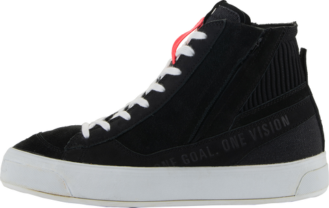 Anatomically engineered for an optimized women's fit, Alpinestars modern interpretation of a retro street sneaker, Combines styling of minimalistic skate pumps with a thick vulcanized sole to create a protective yet supremely comfortable riding shoe with a stripped back, edgy style that looks great in any urban riding environment, Women's specific last is engineered and optimized to follow natural shape and contours of women's feet for maximum rider comfort, on and off bike, Mid sole features an 8mm platform along its entire length to offer greater elevation for shorter riders, Main upper constructed from Nubuck, canvas and split suede for optimal blend of durability and comfort, Split suede toebox for enhanced durability, Classic lace closure at front with a lateral zip for a secure, precise fit, Ankle collar constructed with soft knitted mesh for enhanced rider comfort, Dual layer mid sole support for optimal comfort and support, Alpinestars vulcanized rubber urban sole with bandage for sole for optimal grip and comfort, on and off bike, Ortholite? insole delivers long-term cushioning and high level of breathability and comfort, Integrated dual density ankle disks for impact protection with external multi-layer padding for additional coverage, Alpinestars Transversal Protection Frame (TPF) protects the foot while delivering necessary support on footrest without compromising front foot flexion for superior walking comfort