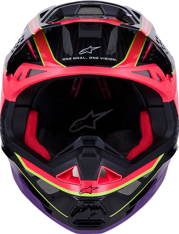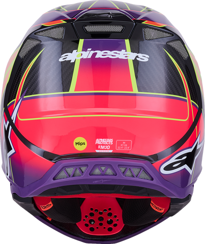 The Alpinestars Supertech M10 Helmet is designed to provide advanced protection and superior comfort for competitive riders. Its aerodynamic profile minimizes air resistance while maintaining a sleek, streamlined appearance, reducing drag and enhancing performance on the track. The helmet's surface curvature promotes reduced friction during impact, allowing energy to deflect efficiently and transfer safely away from the rider's head, offering critical protection for the skull, neck, and spinal column. The shell sizing solution ensures each helmet fits precisely, matching the appropriate shell size to the rider's head for optimal fit, comfort, and impact resistance. This tailored fit helps reduce overall helmet weight and enhances protective effectiveness during high-speed impacts.