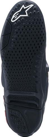 The Alpinestars Tech 10 Boots in Black/Red offer a high-performance design tailored for motocross enthusiasts seeking superior protection and flexibility. Engineered with a dual front and rear blade connector system, these boots provide a seamless and comprehensive flexion control from the foot shell all the way up to the shin plate, ensuring optimal movement and comfort during intense riding sessions. The innovative 'floating' design allows the boot to move freely between lower and upper sections, enhancing natural foot articulation and rider responsiveness.