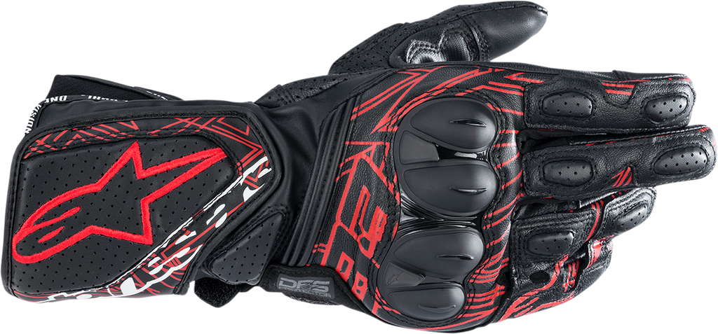 Leather palm for comfort and control and perforated leather on top hand and wrist for excellent levels of breathability, Alpinestars Dynamic Friction Shield (DFS) knuckle protection system features dual density polymer mold construction for superior levels of impact and abrasion resistance, Vented knuckle gusset aids internal airflow for cooling performance, Synthetic suede side reinforcements on landing zones for abrasion resistance and durability, Accordion leather stretch inserts on fingers and thumb to increase fit and directional movement and comfort, Thumb and palm reinforcements constructed from advanced elastomer for a superior grip and movement