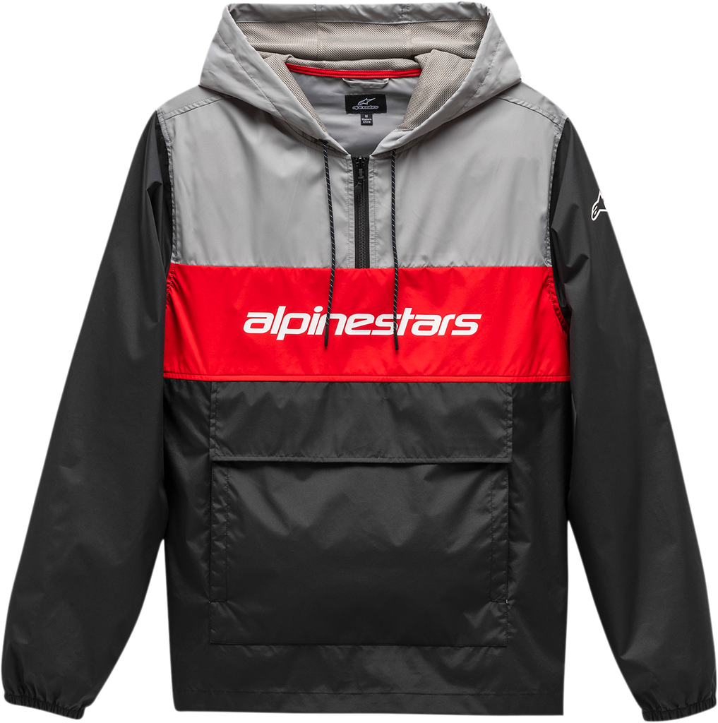 100% Polyester, 240T 600mm DWR Coating, Light weight color blocked anorak jacket, Fixed hood with drawcords, reverse coil half front zipper, Under pouch hand pockets, bungie adjusters at hem, elastic cuffs, Internal main label and external label branding, Logo at chest