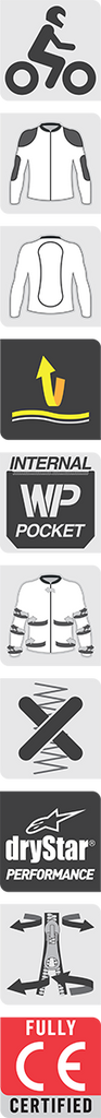 Polyamide fabric laminated shell construction, 8 ventilation zippers on upper chest, arms back and the side of the body, Laminated Drystar® membrane, Elbow aramidic fiber reinforcement, Large stretch panel on the back of the shoulders and arms to increase flexibility and movement, Waist connection zipper allows attachment to Alpinestars riding pants, Multiple reflective prints to increase night visibility of the rider, Touring collar construction with microfiber comfort edging plus 3D textured comfort fabric on inner collar lining, Pre-curved sleeves construction reduces riding fatigue, Microfiber comfort edge on collar and cuffs, Shoulder protection features over-molded advanced TPU guard, Waist adjustment for improved riding fit, Multiple volume adjusters on sleeves, Two front hand pockets, Seamless chest and hands pockets with gusset, Large back utility pocket, 2 Front chest pockets, Cuff adjustment closure system, features dual hook and loop strap securing system, Front inner waterproof pocket, Chest pad and back compartments (Alpinestars Nucleon chest and back inserts available as accessory upgrade, sold separately), Bio Air shoulders and elbow protectors, Compatible with Tech-Air® street system