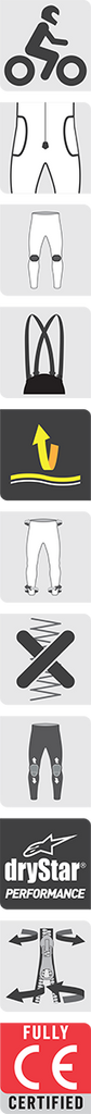 Premium multi-fabric main shell construction incorporating strategic ballistic nylon reinforcements, 2 seamless cargo pockets with gussets., 2 zipped hand pockets., 4 ventilation zippers., Reflective prints on side of the pant for better visibility of the rider., Hook and loop strap on waist adjuster., Stretch inserts on the crotch and knee, Leg volume adjustments, Laminated Drystar® membrane for guaranteed levels of waterproofing and breathability without excessive material bulk for a pant that can withstand the stresses of adventure touring.