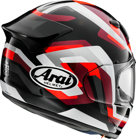 3D Arai logo duct, just 3.5 mm in depth, feeds two central 10 mm intake ports, Logo duct is designed to breakaway in the event of an impact, The one-piece aerodynamic rear exhaust/spoiler, operated by a 3-way switch, is inspired by the DF-X2 of the Corsair-X, but redesigned for touring use, Aerodynamic rear spoiler with one piece exhaust function, Logo duct works well at low speed and with an upright riding position and can be opened or closed easily with summer or winter gloves, via a short-stroke lever placed at the top* if the rider can't see the lever and the logo is in its normal place, the duct is open, Rear spoiler sits a little more forward on the shell and is fed by 3 ports in the shell and efficiently draws air, but also smooths airflow over (and from the side) of the helmet, improving stability and reducing buffeting, especially while overtaking at highway speeds resulting in much less rider fatigue, Manufactured as thin and light as possible, the aerodynamic rear spoiler is designed to crush or break away upon impact, therefore having no influence on protective performance, Sliding chin vent actuating mechanism is thicker and easy to use with gloves, Designed to fit and connect a communication system easily on the shell exterior and without any compromise to the protection offered by the inner EPS liner, 3-position (open, midway and closed) sliding air-scoop chin vent which flows a large intake volume of air and has a replaceable filter, Outer shell design outlines a stylish, organic shape and uses Peripherally Belted Complex Laminate Construction (PB-cLc2) for lightweight strength and integrated side ducts, Extra layer of super fiber belting, in outer shell, maintains rigidity in a crucial area while offering flat sides for easy fitment of an intercom system, With Variable Axis System (VAS), the visor mounting position is lowered, yielding an average of an additional 24 mm across both temple areas, in pursuit of the ideal smoother shape that increases the ability of glancing off energy, For a nice, clean final look and ride, a small stitched opening on the inside of the neck roll allows the intercom system installer to easily tuck away any excess wiring that may be left-over after installing the speakers, Shell flares 5 mm around the opening, making it easier to get the helmet on and off (for newcomers to Arai, the initial 'snugness' when putting the helmet on or taking it off can be challenging)