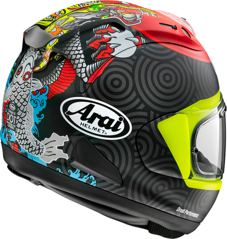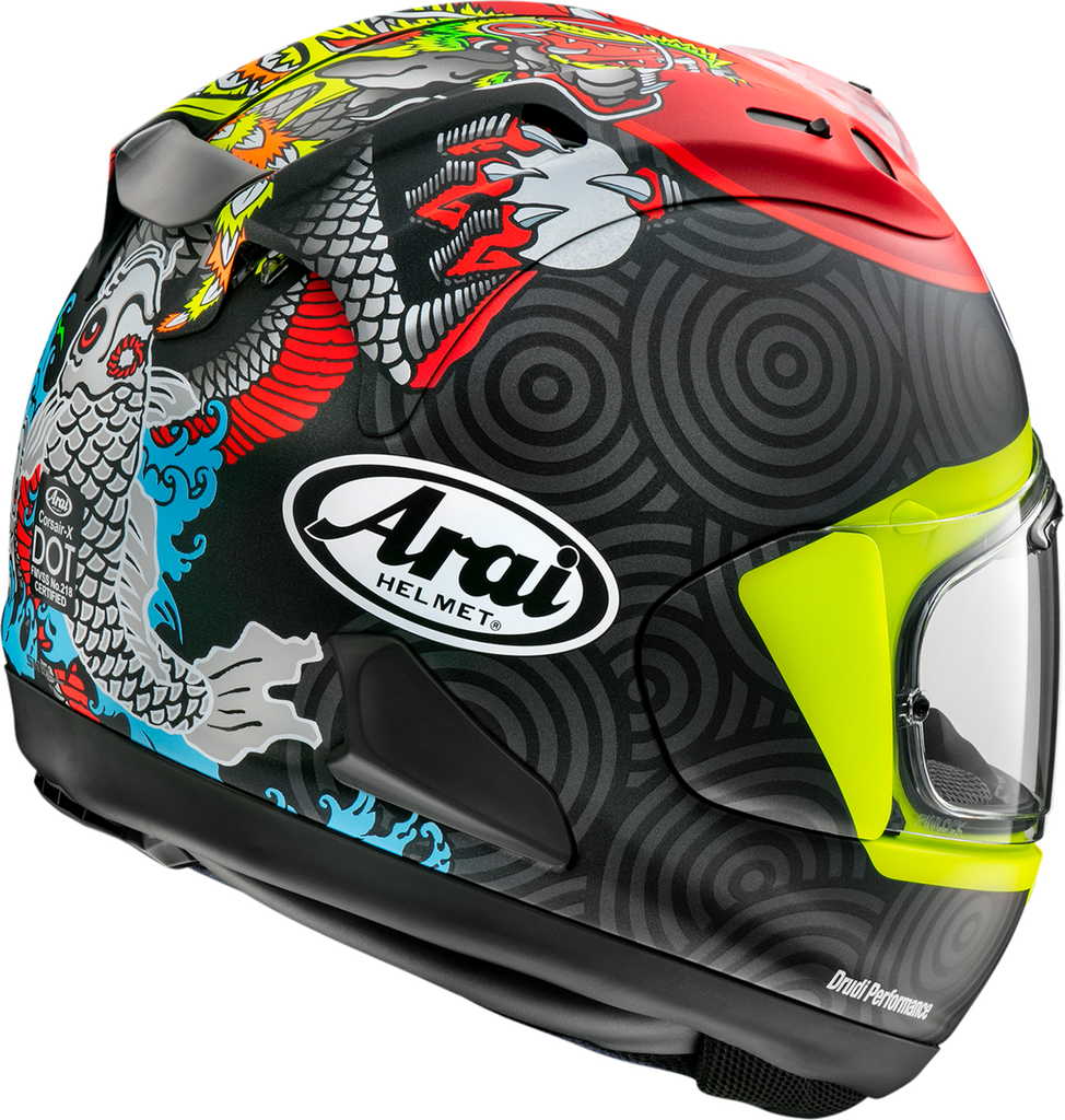 The ARAI Helmets Corsair-X Tatsuki Large Motorcycle Helmet combines innovative design with advanced safety features for a superior riding experience. Its VAS Shield Mechanism allows for effortless shield changes, featuring a dual-function lever that releases both the side cover and shield pin for quick removal. The variable axis system, with a moving pivot point, ensures smooth opening and closing even with the lower shield mount position, providing convenience and efficiency during rides. The larger shield latch enhances ease of operation, incorporating a de-mist function and secure holding to prevent accidental opening, making it suitable for varying weather conditions.