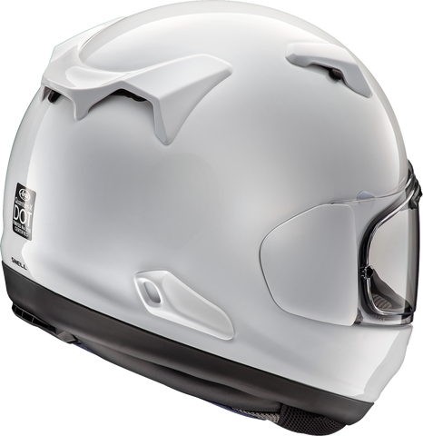 The ARAI Helmets Quantum-X Helmet in white offers a premium riding experience with its innovative design and advanced features. Its round oval shape, achieved through an interior headliner combining thicker front and rear pads with thinner side pads, is tailored for riders with slightly wider heads, providing a comfortable and secure fit. This ergonomic design enhances overall comfort and helmet stability during long rides. The shell employs a Peripherally Belted - Super Complex Laminate Construction (PB-SCLC), which integrates multiple materials to deliver durability, impact resistance, and affordability in a lightweight package. This construction ensures the helmet can withstand impacts while remaining comfortable for extended use.