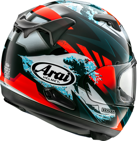 The ARAI Helmets Quantum-X Wave helmet is designed for riders seeking optimal comfort and advanced safety features. Its unique round oval shape, achieved through an interior headliner combining thicker front and rear pads with thinner side pads, ensures a secure fit for riders with slightly wider heads. This tailored design enhances comfort and stability during rides, reducing fatigue and ensuring the helmet stays snugly in place. Constructed with the peripherally belted - super complex laminate construction (PB-SCLC) shell, the helmet offers a durable yet lightweight profile, combining multiple materials and techniques for superior performance and affordability.