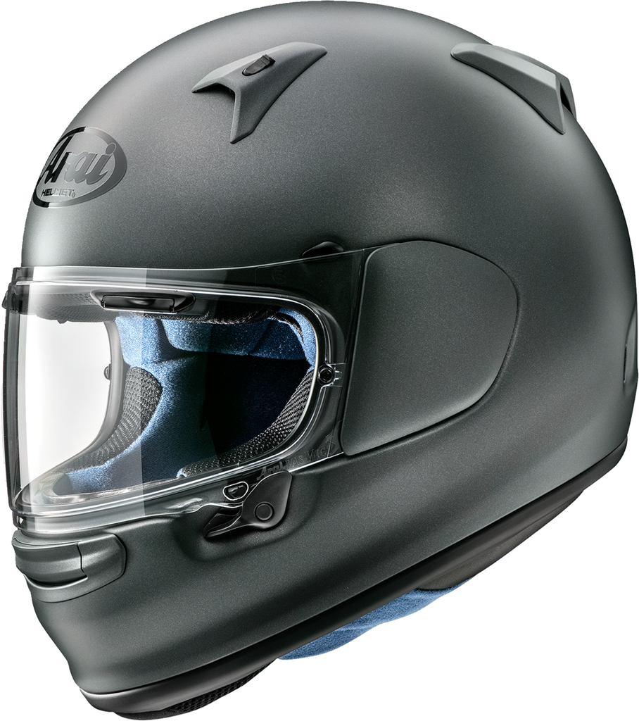 The Arai Helmets Regent-X in Gun Metal size Large (Part Number 0101-17548) offers advanced helmet technology designed for optimal safety, comfort, and ease of use. Crafted with the innovative Variable Axis System (VAS), this helmet features a shield mechanism that allows quick, intuitive, and seamless shield operations. The larger latch enhances user convenience, while the VAS latch securely holds the shield in place, reducing the risk of accidental opening during rides. The VAS pivot cover is engineered to be smaller and lower, providing more space above the cover for better airflow and comfort. Its intermediate oval shape ensures a comfortable fit for the majority of North American head shapes, making it an ideal choice for diverse riders. The shell is constructed from Peripherally Belted Complex Laminate Construction (PB-CLC), combining lightness with exceptional strength for reliable protection. Additionally, the helmet features an adjustable perimeter liner and cheek pads that allow for a personalized fit, enhancing comfort during long rides. The one-piece exhaust vent design improves airflow and aerodynamic stability, helping to keep the rider cool and dry. The soft-brushed, removable liner offers easy cleaning and superior comfort, while FCS? cheek pads with multi-layer foam and foam *spring* support cradle the face, blocking wind noise and providing a snug fit. The shell's smooth design along the Snell test line in the temple area increases impact resistance by allowing the helmet to glance off objects effectively. Flaring the shell 5 mm around the base simplifies donning and removal without compromising security thanks to the FCS2 cheek pads. The top exhaust vent remains continuously open, facilitating heat extraction and moisture removal from the eye port area, which helps prevent shield fogging. Overall, the Arai Regent-X combines innovative features and meticulous craftsmanship, offering riders a helmet that excels in safety, comfort, and practicality for everyday use or long-distance riding.