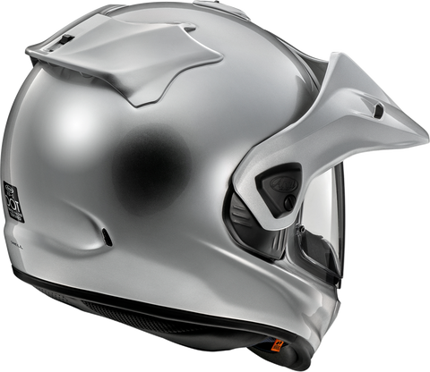 The ARAI HELMETS XD-5 Helmet in Aluminum Silver offers advanced protection and innovative features designed for serious riders. Its PB-cLc? shell construction combines a variety of materials, delivering a durable and impact-resistant outer shell. The forehead area is reinforced with a super fiber belt, similar to banding used to strengthen barrels, providing enhanced structural integrity. The VAS-A shield system allows for quick, tool-free shield swaps, with a single screw on each side simplifying the process. This feature ensures minimal downtime and quick adjustments during rides. The helmet*s peak is designed for more effective ventilation, improved high-speed airflow, and increased adjustability for sun blocking, all contributing to a more comfortable riding experience. The VAS-A Max-Vision shield, compatible with an advanced Pinlock? insert, provides fog resistance across the entire field of view, maintaining excellent visibility even in extreme conditions. An AR spoiler positioned for adventure riding reduces fatigue caused by turbulent air and helps extract hot air from the crown area, improving overall comfort on long rides. The helmet's odor-resistant interior enhances freshness, while the integrated mouth and inner shutters allow precise control of airflow, directing fresh air toward the rider*s face or shield while reducing fogging. The front logo duct facilitates airflow unaffected by rider position, with unobtrusive vent openings in the forehead area that do not compromise safety. All these features combine to deliver a helmet that is both highly functional and comfortable, suitable for high-performance riding in a variety of conditions.