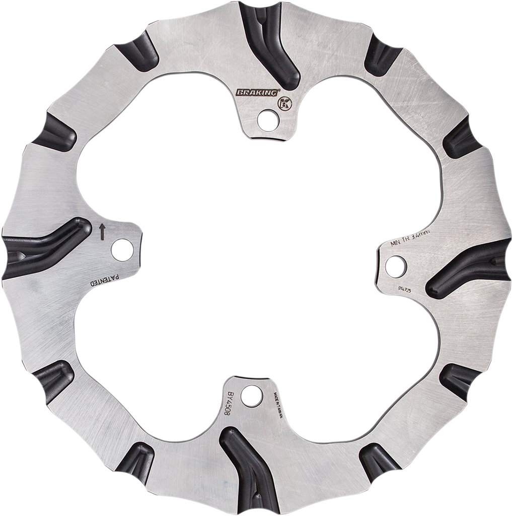 The Batfly system improves the rider's feeling and the response during the overall braking event and brings the performance to the top of the category, The Batfly system, thanks to the special grooves on the rotor, represents a great evolution in heat dissipation, due to the area that alternatively is not covered by one of the pads, Heat generated on one side can be dissipated inside the ventilation channel created between the other side pad and the disc, Control of the dilation at high temperatures means better, resistance, compared to a round disc, in case of extreme thermal stress, The Batfly system cleans and renews the pad surface at each pass on the grooves, maintaining the friction coefficient of the pads at the maximum level