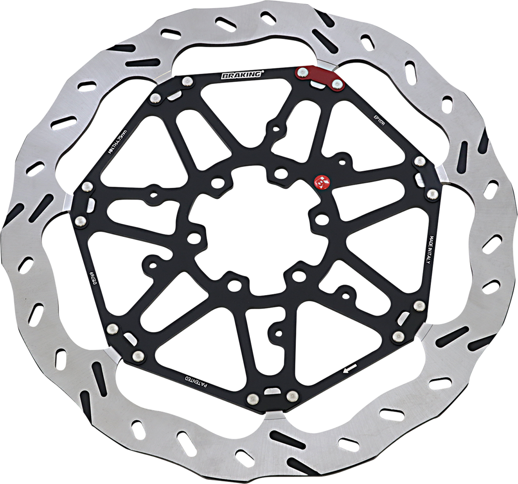 Designed with input from Braking's working experience with best teams in most important competitions in the world (SBK and SS), The braking track ensures a better heat dissipation, ensuring a steady friction coefficient, The new connection structure allows a more controlled radial axial play, with a better load transfer between the braking track and the carrier, Thermal design optimized, Maximum weight-to-performance ratio, Consistent disc temperature, Absence of heat spots, Direct load transfer between rotor and hub, No pin deformation due to applied load