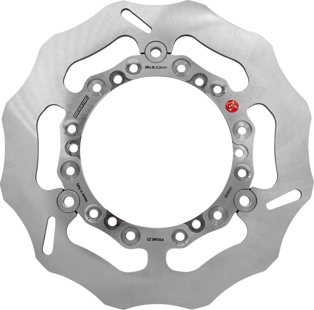 Wave outer profile designed for better heat distribution , Oversize thickness 4.5 mm and full friction ring to maximize heat capacity, 3 fixed points to increase stiffness, and 3 floating to better manage the deformation due to heating, Pins are flush on the outer side, for maximum clearance with caliper and bracket