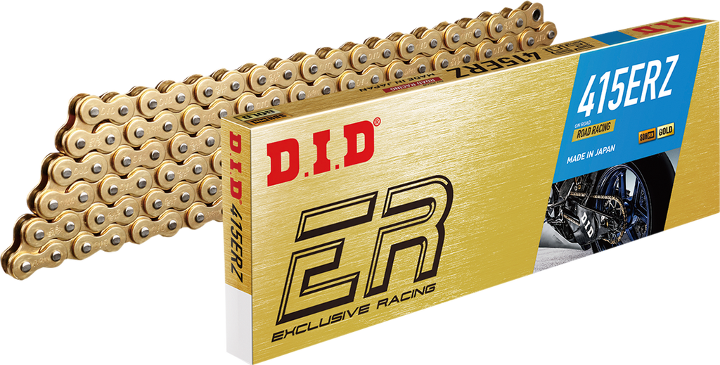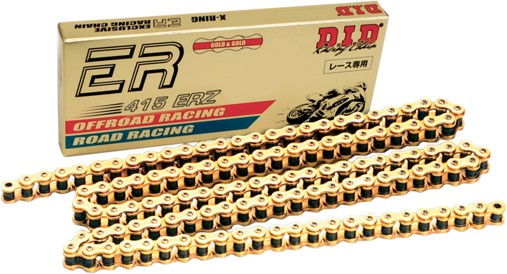 The DID 415 ERZ Series Racing Chain is engineered for high-performance Mini MX and Road Racing bikes, offering exceptional durability and lightweight design. Crafted to meet the rigorous demands of competitive racing, this chain features advanced SDH (Super Die Hard) pin treatment that significantly enhances wear resistance and extends service life. Its robust construction ensures reliable power transfer and durability during intense riding conditions. With a tensile strength averaging 4,540 lb., this chain provides a 15% increase in strength compared to previous models, delivering added security and performance for serious racers. Designed as part of DID's Exclusive Racing Series, it balances lightweight agility with durability, making it ideal for racing enthusiasts seeking peak performance. The chain’s non-sealed design reduces weight further, optimizing acceleration and handling while maintaining essential strength and resilience. Whether you're upgrading your Mini MX or Road Racing bike, the DID 415 ERZ Series chain delivers the reliability and performance that competitive riders demand, all in a 120-link configuration that ensures a perfect fit for your racing setup.
