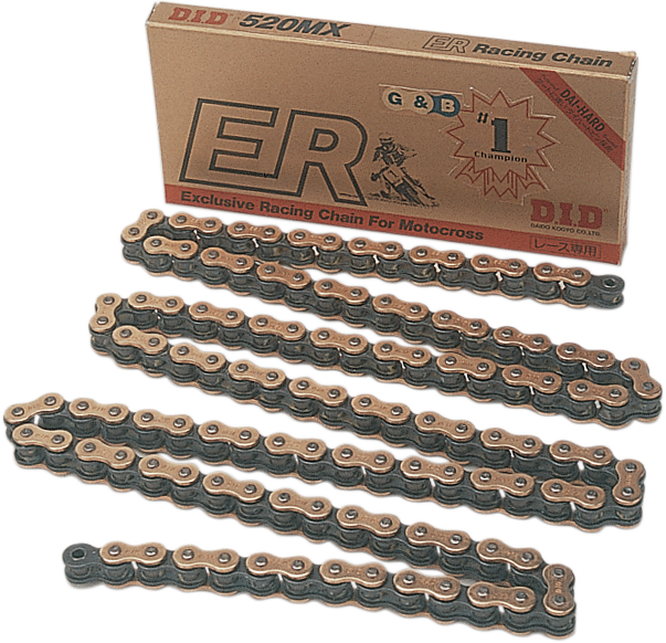 The DID 520 MX series chain is engineered for motocross and off-road racing, offering exceptional durability and strength. Built with non-sealed design, this chain delivers a tensile strength of 8,930 lbs., making it one of the highest-rated non-sealed chains available. It is specifically designed to withstand the rigorous demands of competitive racing, ensuring reliable performance even under extreme conditions. Trusted by professional teams and champions, the DID 520 MX chain is the preferred choice for riders competing in various disciplines, especially within the 450 class category. Its robust construction provides excellent resistance to the impacts and stresses encountered during high-intensity off-road events. The chain features a stylish gold and black finish that not only enhances the look of your motorcycle but also offers corrosion resistance for long-lasting performance. Whether for racing or high-performance riding, this chain delivers the strength, durability, and reliability needed to get the most out of your motorcycle. Proper installation and maintenance of this chain will ensure optimal performance and longevity, making it a valuable upgrade for riders seeking top-tier quality. The 120-link configuration provides a perfect fit for a wide range of motocross bikes, offering both performance and peace of mind during demanding rides.