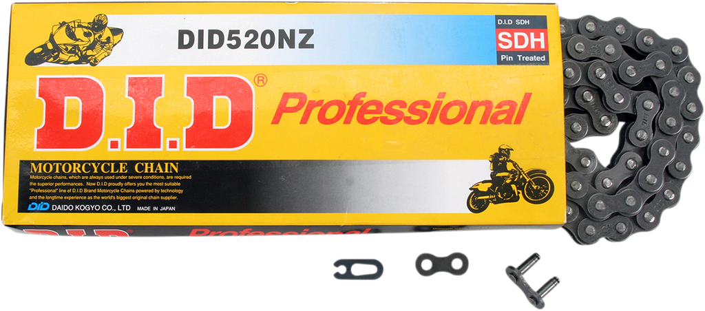 The DID 520 NZ is an excellent choice for vintage and lower displacement off-road motorcycles, offering a reliable and high-performance chain solution. Designed as a non-sealed chain, it provides improved durability and performance compared to OEM non-sealed options, making it ideal for riders seeking enhanced reliability on rugged terrain. The chain features DHA pin treatment, which forms a hard chromium-carbide layer on the pin surface, significantly increasing wear resistance and longevity. Built with quad-stake riveted pins and solid bushings, the DID 520 NZ ensures superior strength and durability for demanding riding conditions. Its black finish not only adds a sleek look but also provides additional corrosion resistance, making it suitable for various outdoor environments. Whether you are restoring a vintage bike or upgrading your off-road machine, this chain offers a perfect balance of performance and durability, giving you confidence in every ride. With 120 links, it provides ample length for most motorcycle setups, ensuring compatibility and ease of installation. Trust the DID brand for high-quality motorcycle components designed to meet the demands of serious riders and enthusiasts alike.