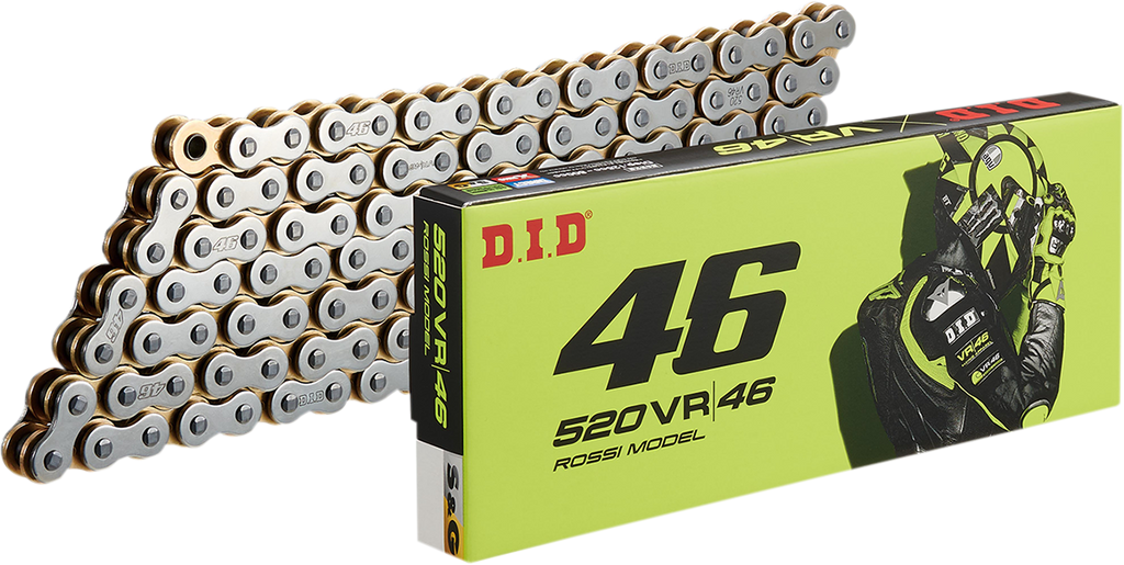 Designed in collaboration with renowned motorcycle road racer Valentino Rossi, this chain combines professional-grade engineering with a unique aesthetic. The gold inner plates paired with silver outer plates give it a distinctive and stylish appearance, making it suitable for riders who value both function and form.
