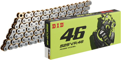 The DID 525 VR Chain with 110 links is engineered for high-performance motorcycle applications, combining durability and precision in a lightweight design. Featuring an innovative X-Ring seal system, this chain offers low-friction operation and enhanced sealing performance, which contributes to longer chain life and improved overall engine efficiency. Designed in collaboration with renowned motorcycle racer Valentino Rossi, the M525VR46SG110 reflects a blend of professional racing technology and everyday reliability. Its unique aesthetic includes gold inner plates and silver outer plates, providing a distinctive look that stands out on any motorcycle.