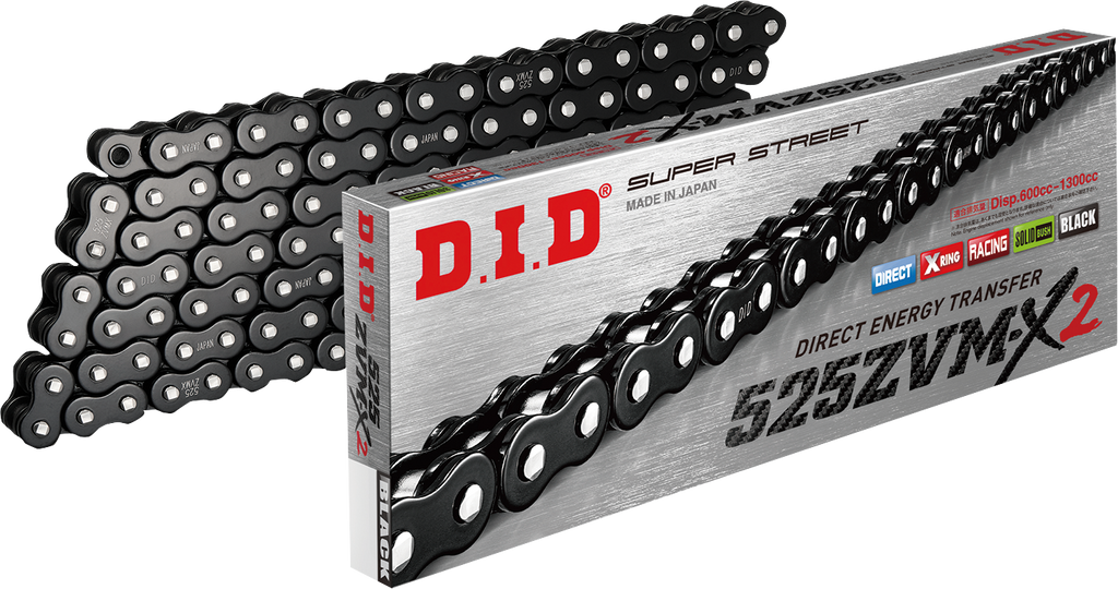 The DID 525 ZVM-X2 drive chain is engineered for high-performance motorcycles requiring exceptional strength and durability. Utilizing DID's patented X-Ring seal, this chain offers superior sealing performance and increased stretch resistance, making it ideal for heavyweight bikes with substantial torque and horsepower. Its design incorporates four contact points that minimize power loss, ensuring efficient power transfer from the engine to the wheels. Built with direct energy transfer technology, the ZVM-X2 chain is born from MotoGP expertise, delivering reliable performance under demanding riding conditions. The chain's robust construction makes it suitable for high-powered street bikes and adventure motorcycles alike, providing a balance of durability and efficiency for aggressive riding styles. Whether you're upgrading your existing setup or building a custom high-performance machine, the DID 525 ZVM-X2 drive chain offers the reliability and strength needed to handle intense riding scenarios. With a black finish, this 120-link chain combines functional performance with a sleek appearance, enhancing both the look and performance of your motorcycle.