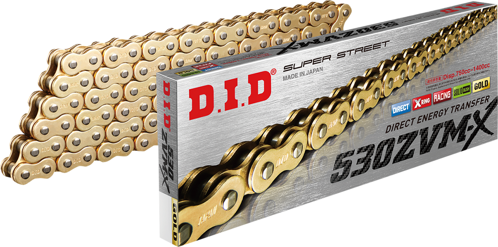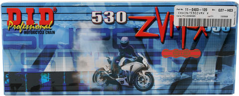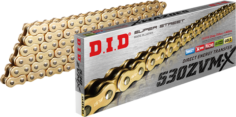 The DID 530 ZVMX - Specialty Series Chain is engineered for high-performance superbike applications, delivering exceptional durability and smooth operation. Featuring all the low friction, high-performance characteristics of the standard X-ring design, this chain provides 40% greater wear resistance, significantly extending the chain's lifespan. This enhanced durability ensures reliable power transfer, reduces maintenance intervals, and maintains optimal performance under demanding riding conditions. Crafted with precision, the ZVMX series chain is ideal for riders seeking both longevity and high efficiency in their motorcycle drivetrain.