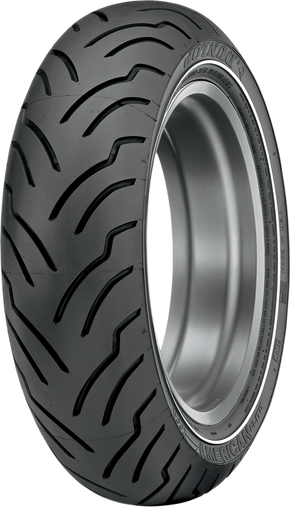 The DUNLOP American Elite Rear Motorcycle Tire, part number 45131818, is specifically designed for Harley-Davidson? bikes. Crafted entirely in the United States, this tire embodies American engineering and manufacturing standards, ensuring high quality and durability. Its construction and design are tested rigorously within the U.S. to meet the demanding conditions faced by motorcycle riders. The narrow whitewall adds a classic aesthetic, complementing the style of vintage and modern Harley-Davidson motorcycles alike. This tire is engineered to deliver a smooth, reliable ride whether you're navigating wet or dry roads. The tread pattern is optimized for even wear, extending the lifespan of the tire while maintaining consistent traction and handling across different terrains and weather conditions. The American Elite series by DUNLOP is renowned for its balance of performance, comfort, and longevity, making it a preferred choice for serious riders who demand the best from their motorcycle tires. Installation is straightforward, and the tire*s robust construction provides confidence during every ride, from casual cruising to spirited riding sessions. Designed with precision and care, this tire ensures your Harley-Davidson remains stylish and dependable on the road.