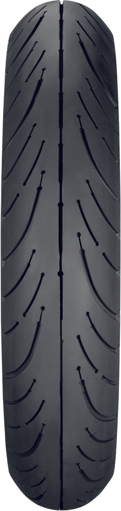 The Dunlop Elite 4 Front Motorcycle Tire (Part Number 45119102) offers exceptional durability and performance for touring, cruiser, and standard bikes. Designed with Dunlop*s innovative MT Multi-Tread* technology, this tire combines a long-wearing center compound with lateral-grip shoulders to maximize mileage without compromising handling. This dual-compound setup ensures even wear and consistent traction throughout the tire's lifespan, making it well-suited for long-distance riding and daily commuting.