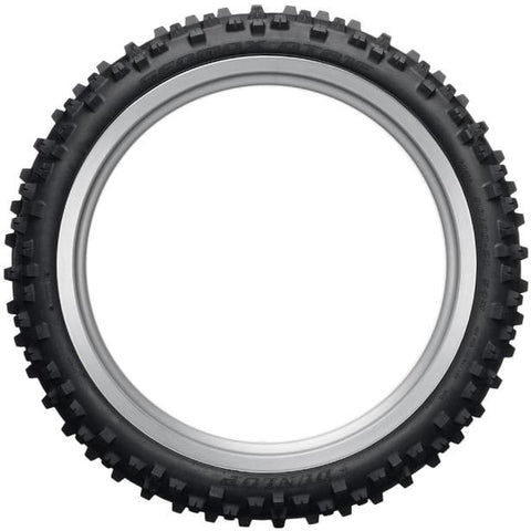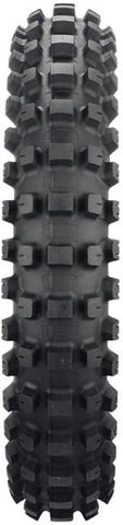 The Dunlop Geomax AT81 Rear Tire, part number 45229521, is engineered for all-around performance with enhanced ruggedness suited for off-road racing and riding. Designed to deliver superior traction across a variety of terrains, this tire features an innovative tread block shape and distribution with flexible knobs that help the tire dig into dirt surfaces for improved grip. Its high-wear-resistant compound ensures durability, reducing chipping, tearing, and uneven wear, making it ideal for demanding off-road applications. The carcass benefits from two nylon plies, providing strength and stability, while lateral shoulder grooves increase biting edges and flexibility for better handling on uneven terrain. The arrangement of the rear center blocks in-line offers a larger contact patch, maximizing traction during aggressive riding. Additionally, Dunlop*s patented *plush pad* recess design between tread blocks enhances bump absorption and ride comfort, ensuring a smoother experience over rough surfaces. The front tire construction includes two nylon plies wrapped with a third polyester ply, creating a robust base that complements the rear tire's performance. Whether used in competitive racing or recreational off-road riding, the Dunlop Geomax AT81 rear tire is built to withstand tough conditions and deliver consistent, high-level traction and durability.