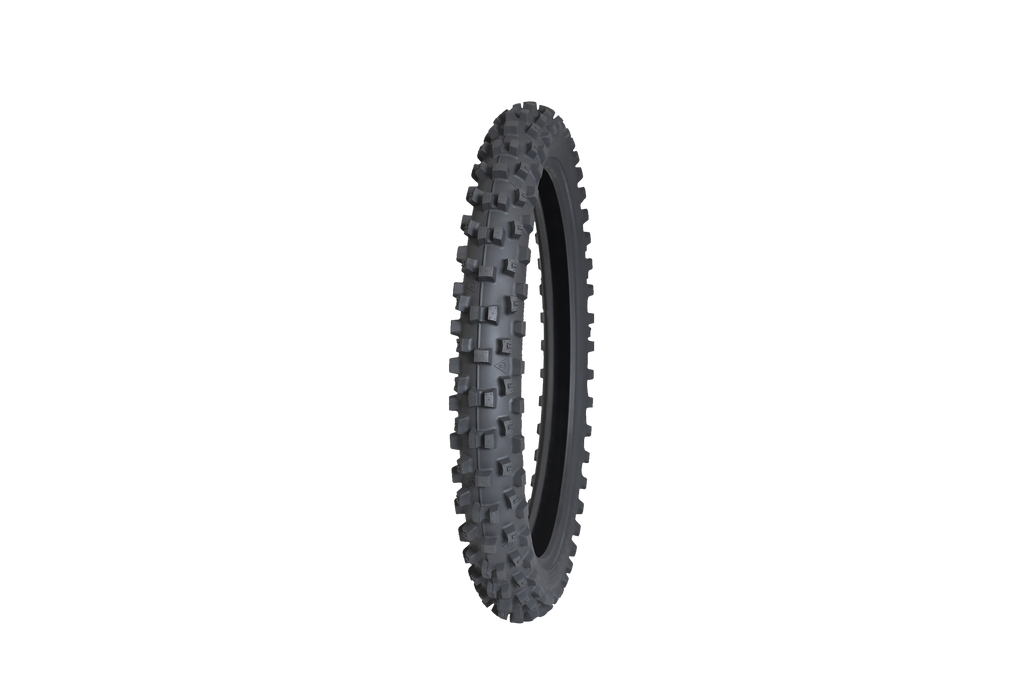 The Dunlop Geomax AT82 Front Tire is engineered to deliver exceptional off-road performance with innovative tread design and advanced construction. Featuring a newly designed front tread pattern, this tire enhances grip and stability across a variety of terrains. The tire's updated compound increases traction while simultaneously improving durability, making it suitable for demanding off-road conditions. Its bias ply construction ensures reliable handling and resistance to punctures, providing confidence during challenging rides. The Geomax AT82 incorporates Progressive Cornering Block Technology, which significantly enhances cornering grip, feel, and absorption, allowing riders to push their limits with improved control and confidence. The tire's reinforced casing architecture offers superior damping and absorption, reducing rider fatigue and smoothing out rough terrain. Designed for versatile terrain, this tire performs well on loose dirt, rocky trails, and muddy paths, making it ideal for competitive motocross and trail riding alike.