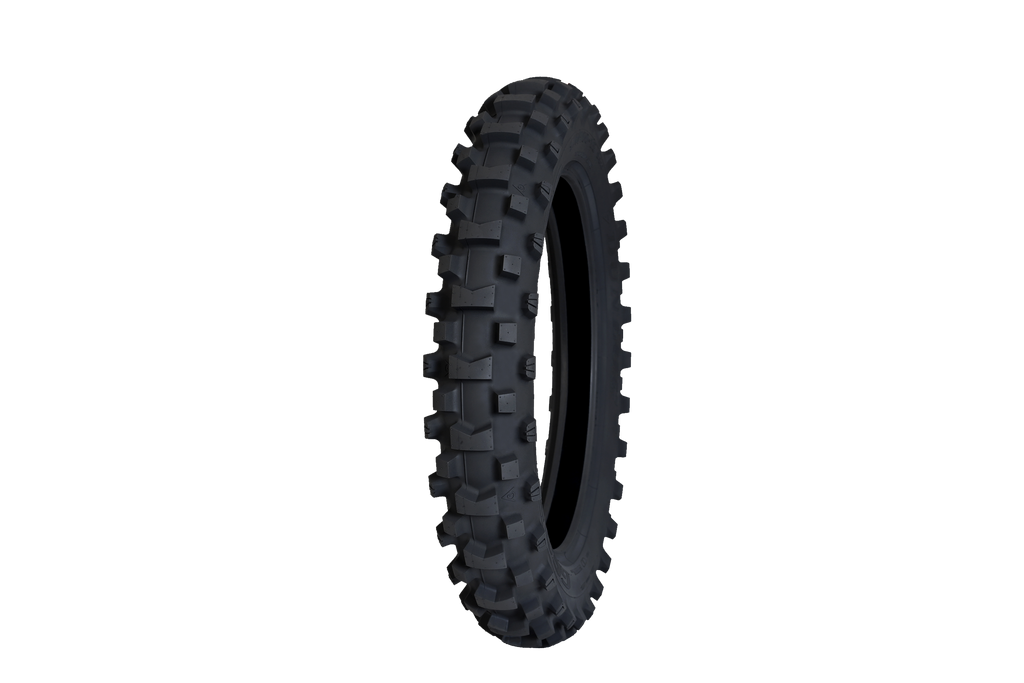 The Dunlop Geomax AT82 Rear Tire, part number 45261503, is engineered for off-road performance with innovative features designed to enhance traction, durability, and handling. This tire features a new bi-directional rear tread pattern, a first for Dunlop in the off-road segment, allowing versatile terrain usage and improved grip in both forward and backward riding directions. Its updated compound provides superior traction while extending tread life, making it suitable for demanding outdoor conditions. The advanced casing architecture enhances damping and absorption, offering a smoother ride over rough terrain and reducing rider fatigue. Both the front and rear tires incorporate Progressive Cornering Block Technology, which significantly improves cornering grip, feel, and absorption characteristics, ensuring better control and confidence during aggressive turns. Whether navigating rocky trails, loose dirt, or muddy paths, the Dunlop Geomax AT82 Rear Tire delivers reliable off-road performance, making it an ideal choice for serious riders seeking durability and superior handling in diverse terrains.