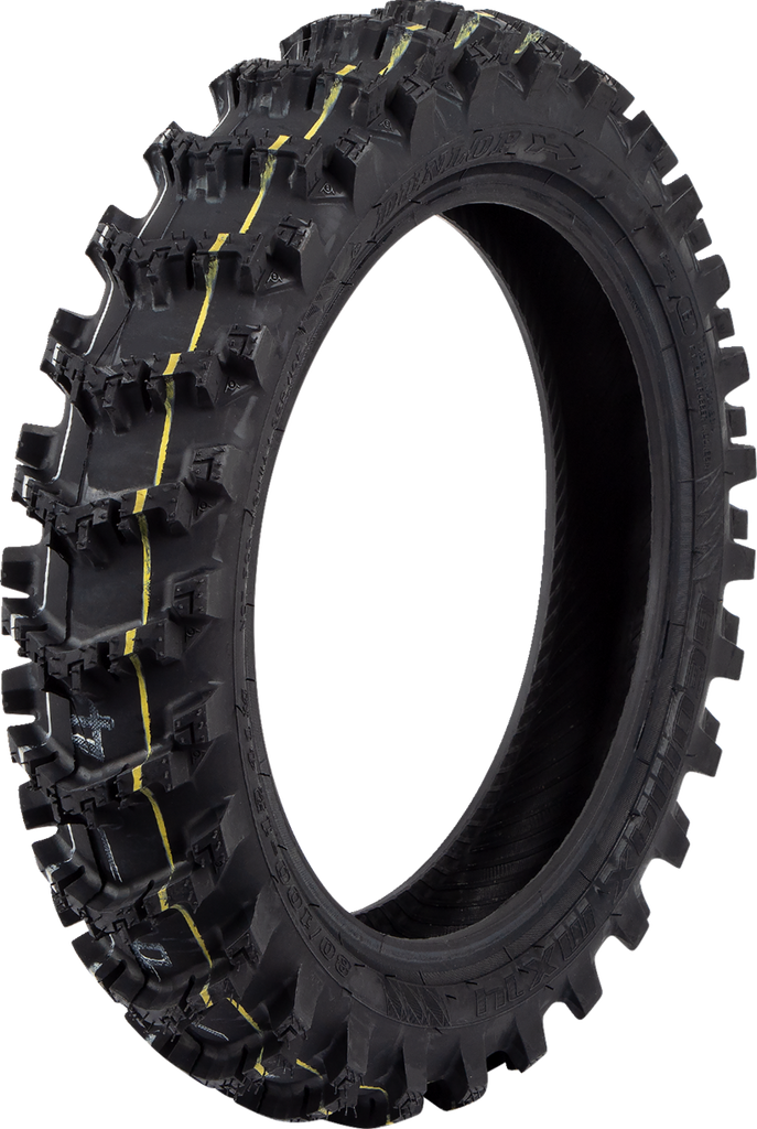 The DUNLOP Geomax MX14 Rear Motorcycle Tire, part number 45259506, is engineered to deliver superior performance on sandy and muddy terrains. Featuring advanced Reinforced Scoop Technology (RST) and V-Block Technology (V-BT Advanced), this tire's optimized tread blocks effectively penetrate soft surfaces, providing enhanced traction and drive grip during starts, straightaways, and exiting corners. Its innovative design ensures confident handling in challenging off-road conditions, making it ideal for competitive and recreational riders alike. The tire's new carcass construction incorporates an additional ply to improve absorption and damping, resulting in greater linearity under load and smoother ride quality. This reinforcement helps maintain stability and control when navigating uneven terrain. The Flexible Fin Technology (FFT) further enhances stopping power and offers more progressive brake control, allowing riders to brake confidently with precise modulation. Additionally, this tire's increased drive-grip improves acceleration and traction, giving riders better control when launching from rest or powering through rough sections. The tire's design also excels in slide control, especially during braking and cornering in loose sand and mud, providing riders with predictable handling and safety. Constructed with durable materials and innovative features, the DUNLOP Geomax MX14 rear tire is a reliable choice for off-road enthusiasts seeking optimal performance in demanding conditions.