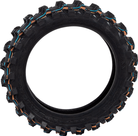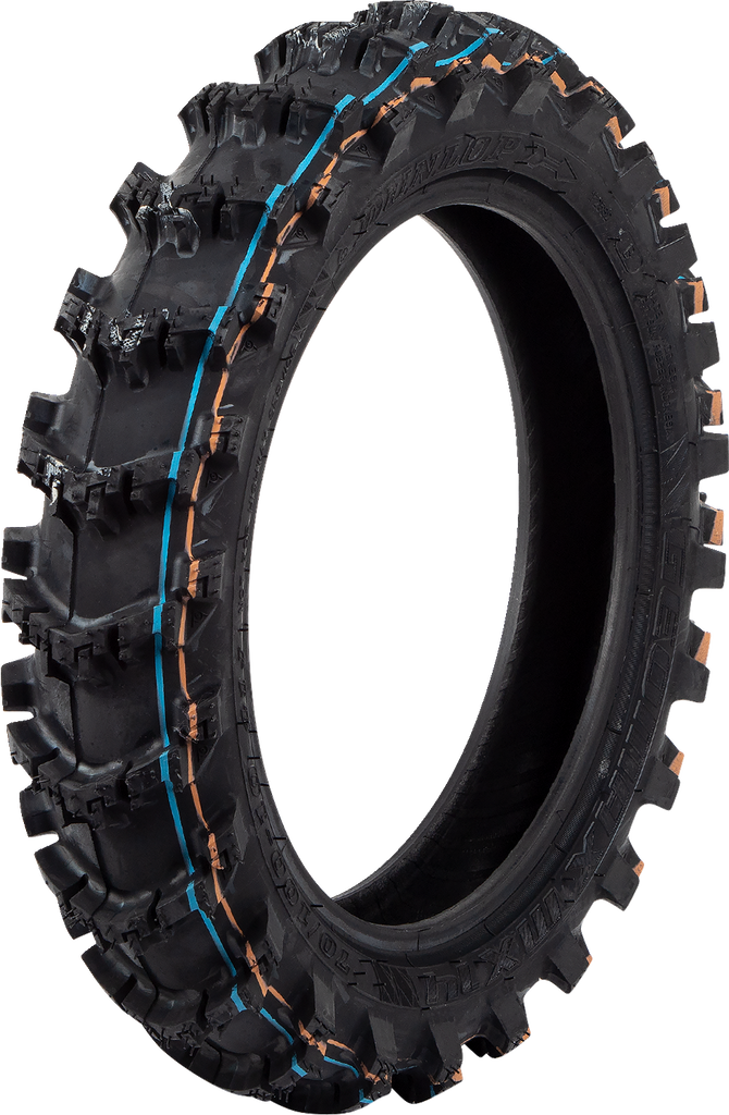 The Dunlop Geomax MX14 Rear Tire, part number 45259500, is engineered for optimal performance in sandy and muddy terrains. Featuring innovative Reinforced Scoop Technology (RST) and V-Block Technology Advanced (V-BT Advanced), this tire's optimized tread blocks deliver superior penetration and scooping ability, ensuring enhanced traction and drive grip during starts, straightaways, and exiting corners. The advanced tread design provides reliable grip in challenging conditions, making it ideal for aggressive riders seeking dependable handling in off-road environments.