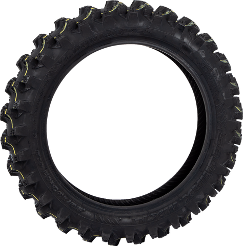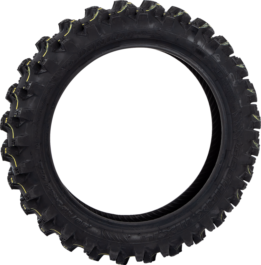 The DUNLOP Geomax MX14 Rear Tire (Part Number 45259501) is engineered for optimal performance on sandy and muddy terrains. Featuring innovative Reinforced Scoop Technology (RST) and V-Block Technology Advanced (V-BT Advanced), this tire's optimized tread blocks effectively penetrate and scoop loose surfaces, providing superior traction and drive-grip during starts, straightaways, and exiting corners. These design enhancements allow riders to maintain better control and confidence in challenging conditions. The tire's advanced carcass construction incorporates an additional ply to improve absorption and damping, resulting in more linear response under load and increased comfort during aggressive riding. Flexible Fin Technology (FFT) enhances stopping power and offers more progressive brake control, enabling precise handling when braking or maneuvering through loose terrain. The combined features deliver increased drive-grip, exceptional slide control, and reliable braking performance, making the DUNLOP Geomax MX14 an ideal choice for off-road riders seeking durability, traction, and confidence in mud and sand environments.