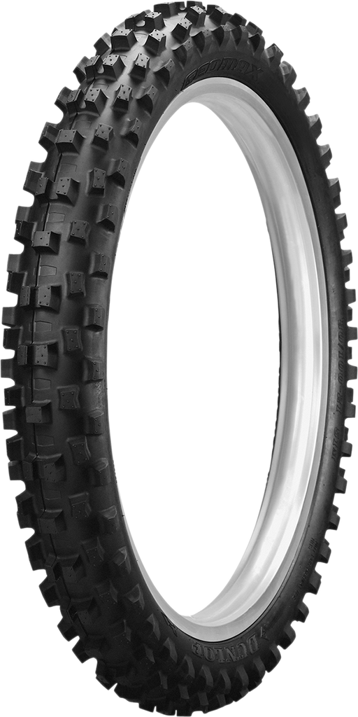 The Dunlop Geomax MX3S front motorcycle tire, part number 45079466, is designed for high-performance motocross riding, drawing from the expertise of top AMA Pro Motocross and Supercross champions like Ryan Dungey. This tire features a robust construction aimed at delivering exceptional handling and durability across a variety of challenging terrains. Its innovative recess carcass design enhances flexibility, reducing knob tearing and extending tire life, ensuring consistent performance during intense riding sessions.