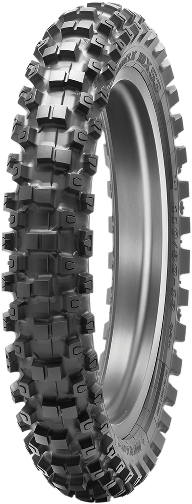 The Dunlop Geomax MX53 Rear Tire is engineered for intermediate-hard terrain, offering exceptional grip and stability. Featuring a horseshoe pattern of blocks on the front tire, this design reduces stiffness in the center, resulting in improved ride compliance and smoother handling on rugged trails. The unique pattern enhances dirt grip, providing confident braking performance even in challenging conditions. The rear tire incorporates an altered Block-In-A-Block shape with increased flex in the knobs, which enhances grip while maintaining stability and slide control during aggressive riding. Dunlop*s Advanced Apex Design is integrated into the sidewall, improving shock absorption by dispersing impacts through a taller, thinner apex, which helps maintain tire integrity and rider comfort during demanding rides. Both the front and rear tires include tie bars between select knobs, effectively reducing flex at the base of the knobs and significantly increasing durability for prolonged off-road use. The addition of Block-In-A-Block technology to the front tire further enhances grip and durability, making this tire a reliable choice for intermediate riders seeking consistent performance across various off-road conditions. Overall, the Dunlop Geomax MX53 rear tire combines innovative tread design, advanced shock absorption features, and reinforced construction to deliver superior off-road traction, stability, and longevity.