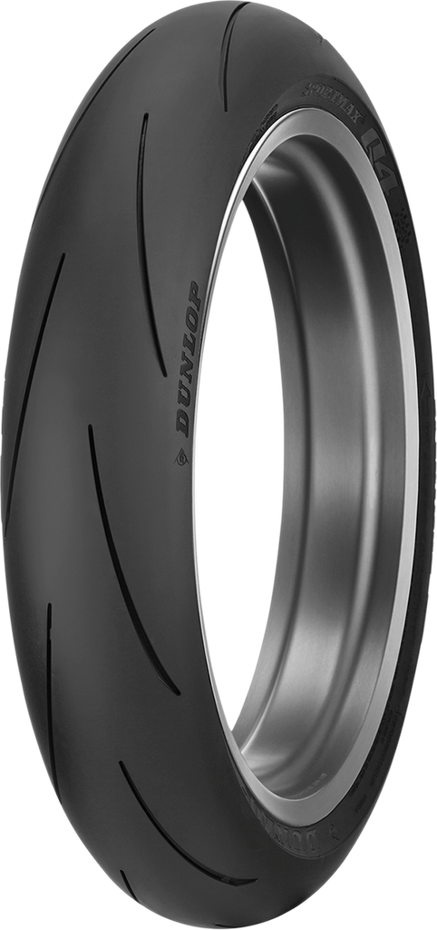 The Dunlop Sportmax Q4 Front Tire (Part Number 45233176) is engineered for riders demanding exceptional handling and stability both on the street and on the track. Featuring Carbon Fiber Technology (CFT), the sidewalls incorporate carbon fiber reinforcement that enhances cornering agility, braking performance, and overall feel, allowing for confident riding at high lean angles. This advanced construction provides a combination of strength and flexibility, ensuring superior grip and control during aggressive maneuvering.