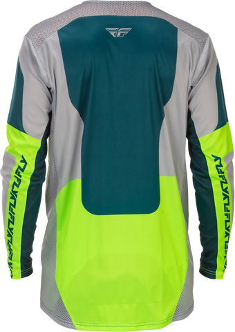 The Fly Racing Lite Jersey in Grey, Lime, and Teal is designed for riders seeking optimal comfort and performance on the trail or track. Crafted with laser-cut perforations, this jersey ensures excellent airflow, helping to keep you cool during intense rides. Its mesh ventilation panels further enhance breathability by dissipating unwanted heat, making it suitable for hot and humid conditions. The jersey features a low profile, streamlined taped collar that reduces bulk and enhances comfort, while the extended tail helps to keep the jersey securely tucked in during dynamic movements. The athletic fit contours closely to the body with minimal excess fabric, providing unrestricted mobility and a sleek appearance.