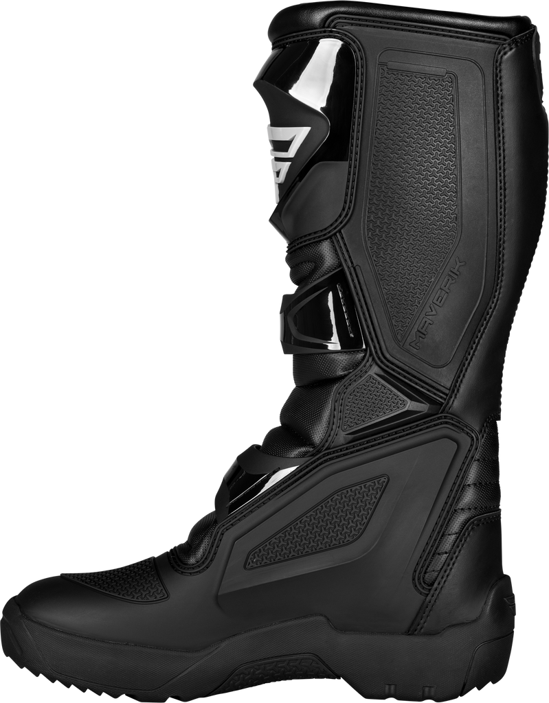 The Fly Racing Maverik Lt Enduro Boot in black offers a combination of advanced construction and innovative features designed for serious off-road riders. Crafted with 3D molded plastic shift panels featuring grooves and texture, these boots help prevent premature wear and provide reliable durability. The articulated rear ankle offers subtle flexibility, allowing natural foot movement while maintaining robust support for demanding terrains. Additionally, the pre-shaped molded plastic 3D shin enhances impact resistance and rider comfort, making them suitable for long wear during intense riding sessions. The inner ankle panel, made of durable and flexible plastic, ensures a snug fit without sacrificing mobility.